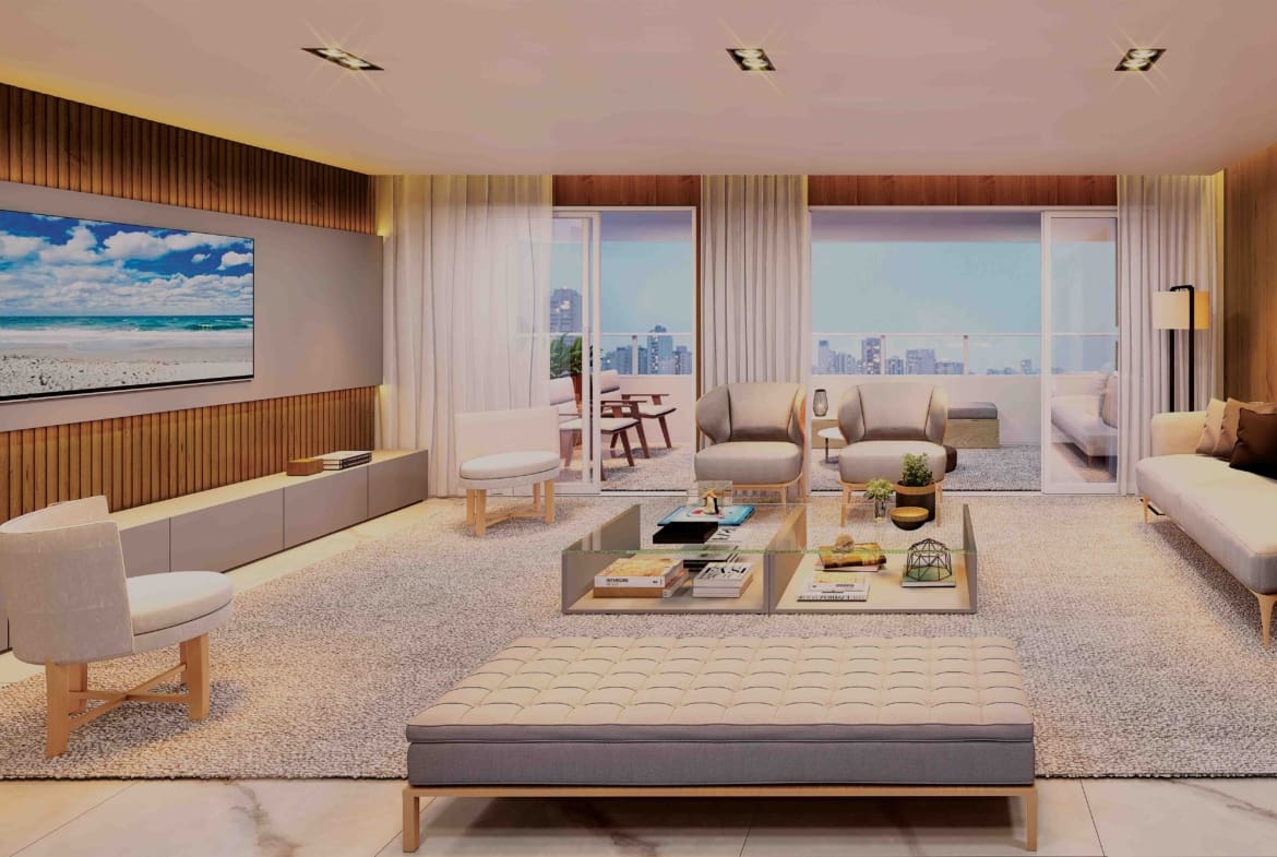 Conforto Acústico e Acabamentos: O apartamento possui manta acústica na laje das suítes e será entregue com piso em todos os ambientes, incluindo porcelanato na sala e piso vinílico nas suítes.