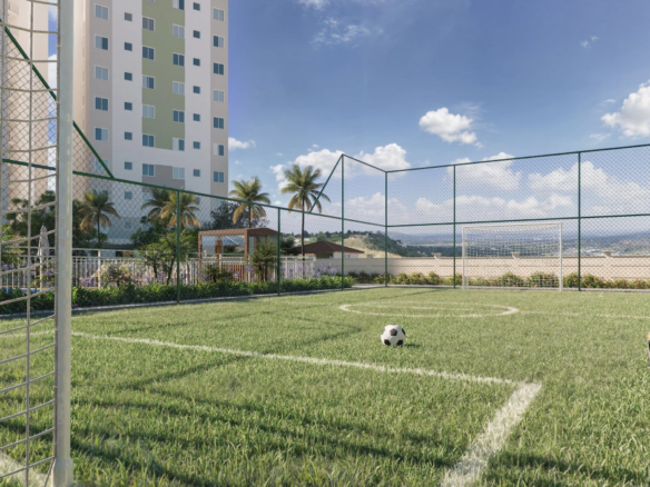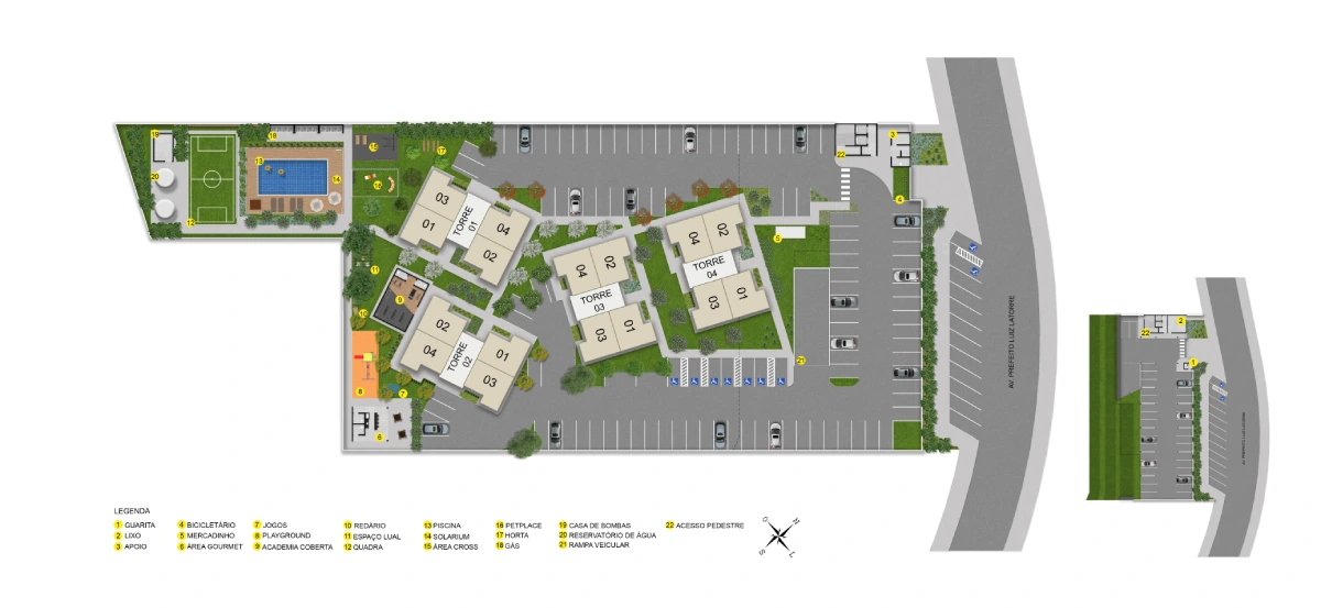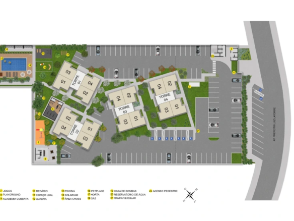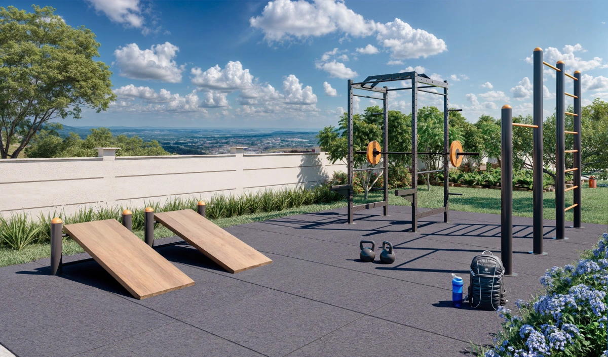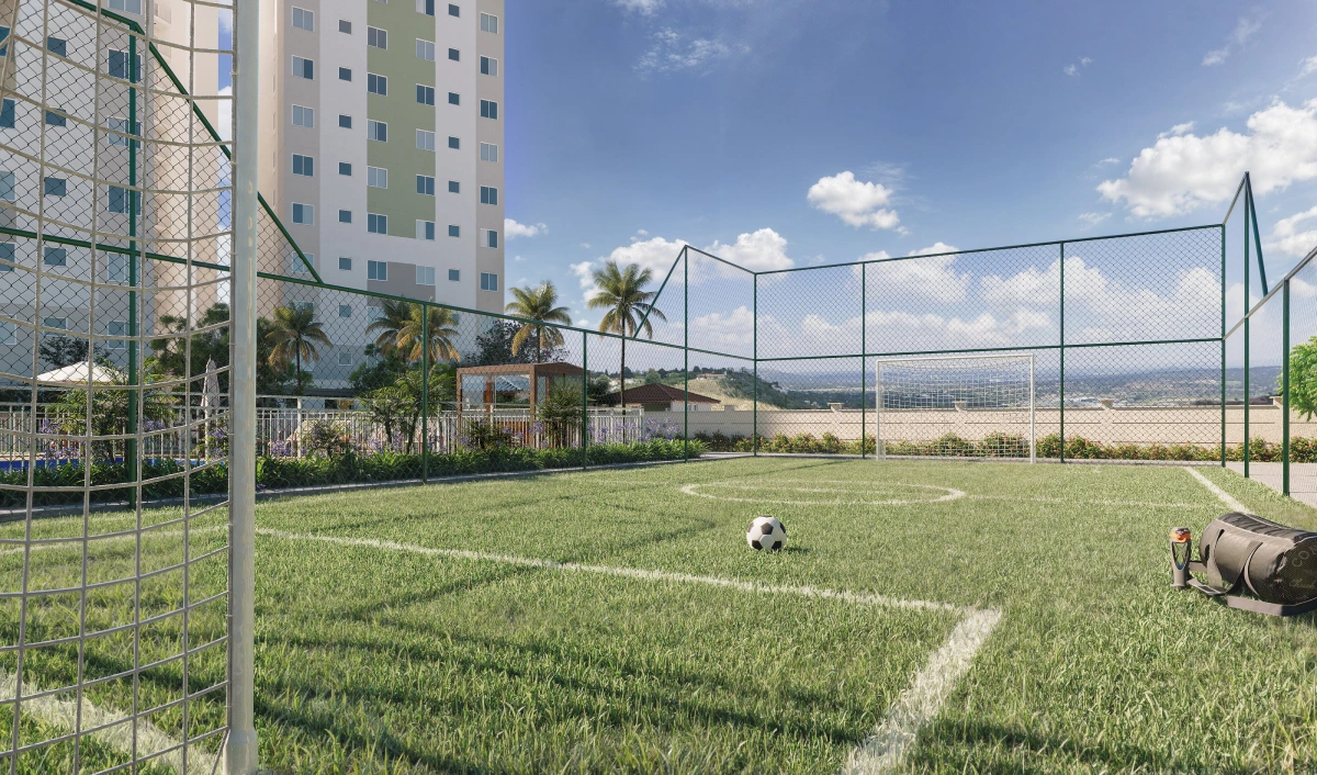 - Saúde e Esportes: Academia, espaço fitness externo e quadra gramada.
